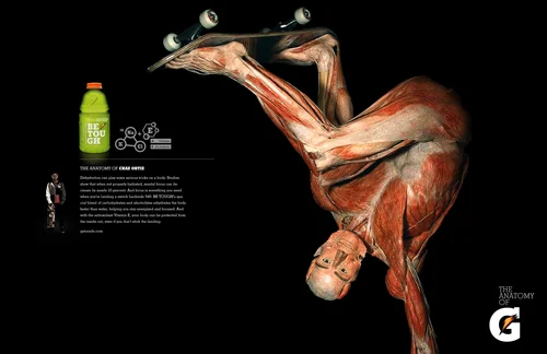As part of the “G” rebrand campaign for Gatorade, we created print ads to highlight the positive effects of new G sports drinks on the human body, while also showcasing some of the G-sponsored athletes recently signed to their roster. Inspired by the Bodies exhibit, we thought it would be cool to shed some skin and give people a look under the hood.